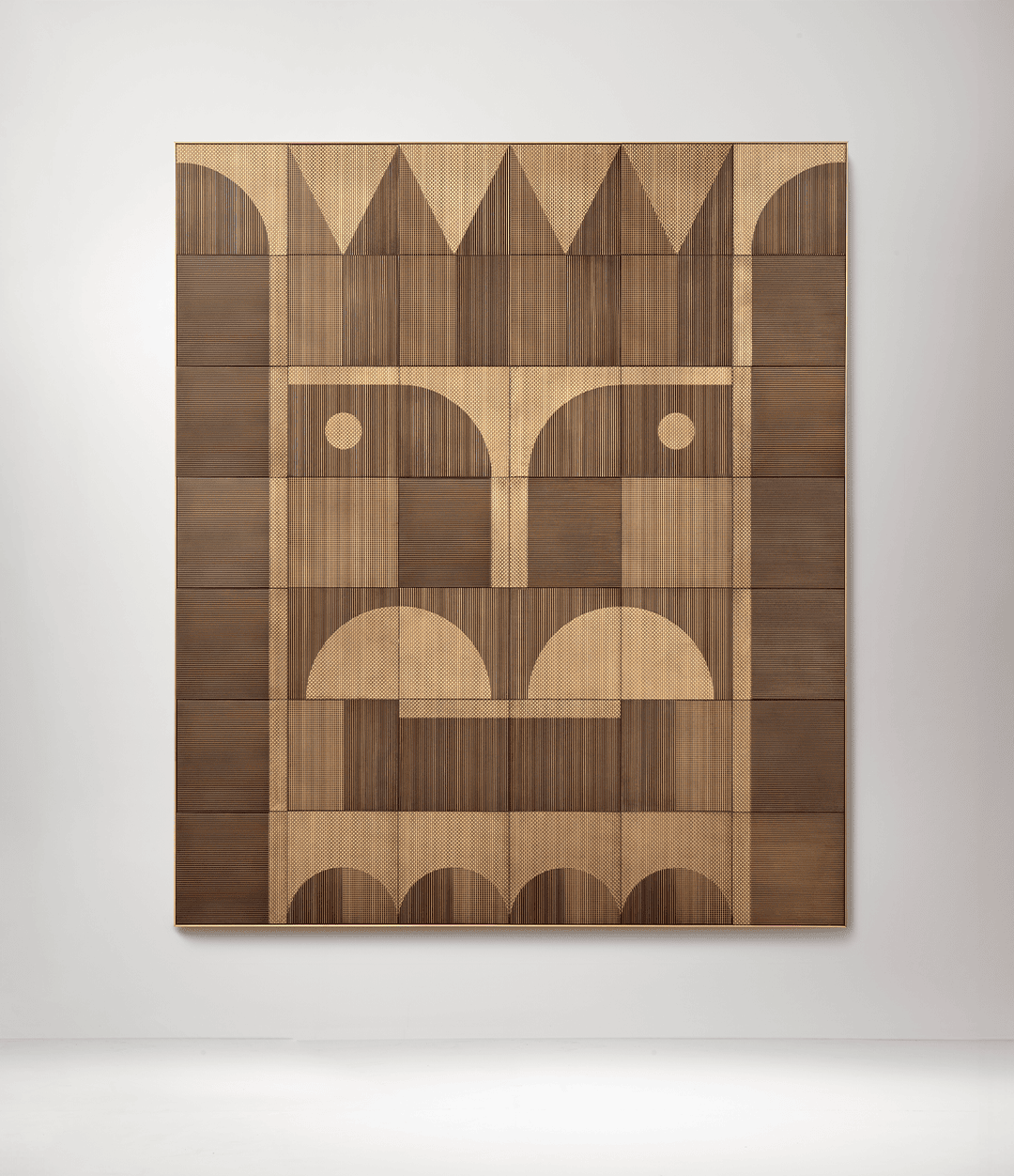 Arazzi Re от De Castelli — это декоративное панно из квадратных латунных плиток с индивидуальной отделкой DeErosion, заключённых в рамку из нержавеющей стали с латунным покрытием. Модель входит в коллекцию DeFrames, где металл выходит за пределы своей традиционной функции покрытия и превращается в художественное полотно.