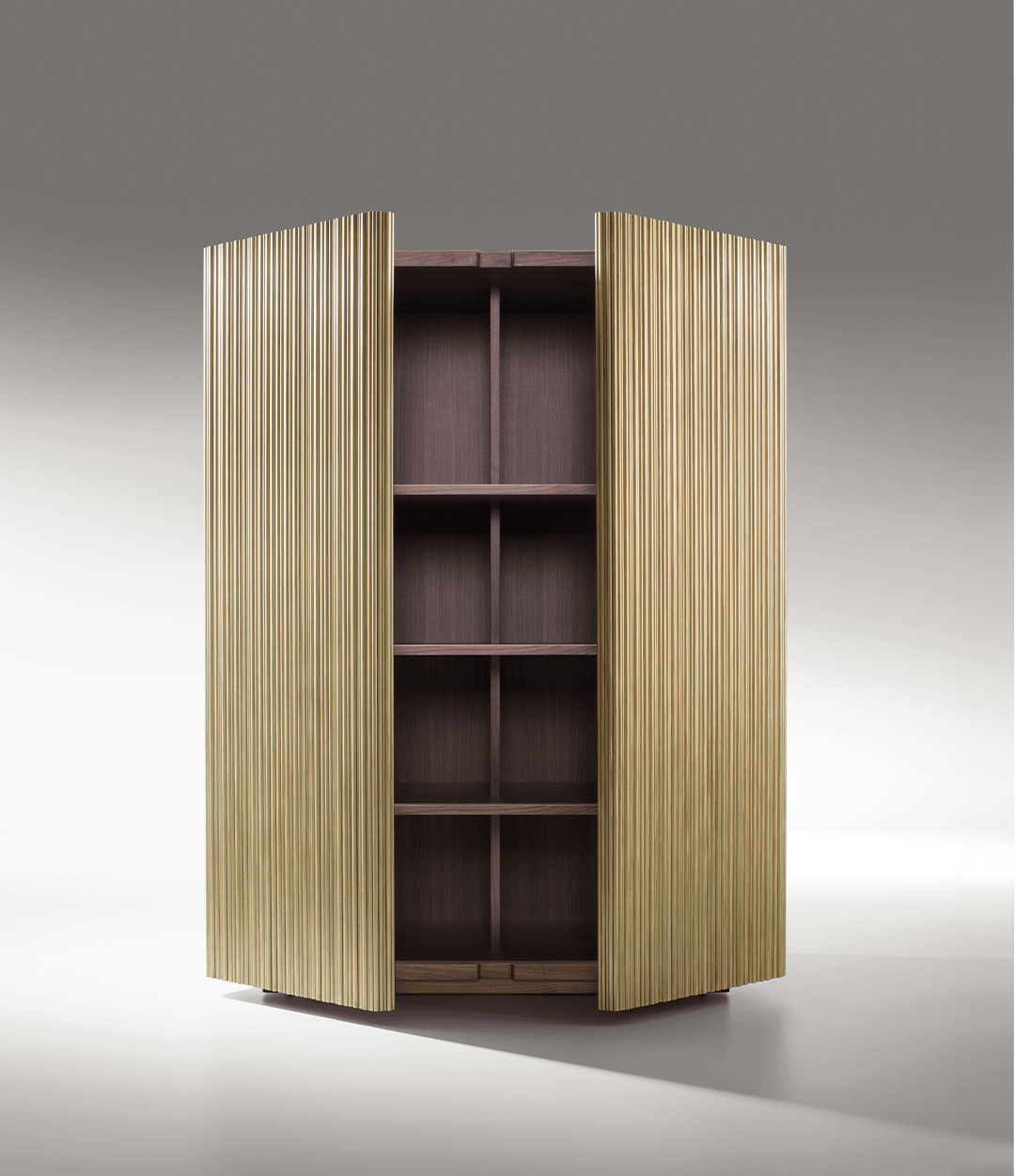 Canneté Cabinet — высокое вертикальное хранилище с двумя L-образными дверцами, открывающимися на 90° благодаря уникальной конструкции. Скульптурная поверхность создаётся рифлёной отделкой из вертикальных металлических стержней разной толщины с сатинированной обработкой, формируя неровные волны и завораживающую игру отражений света.