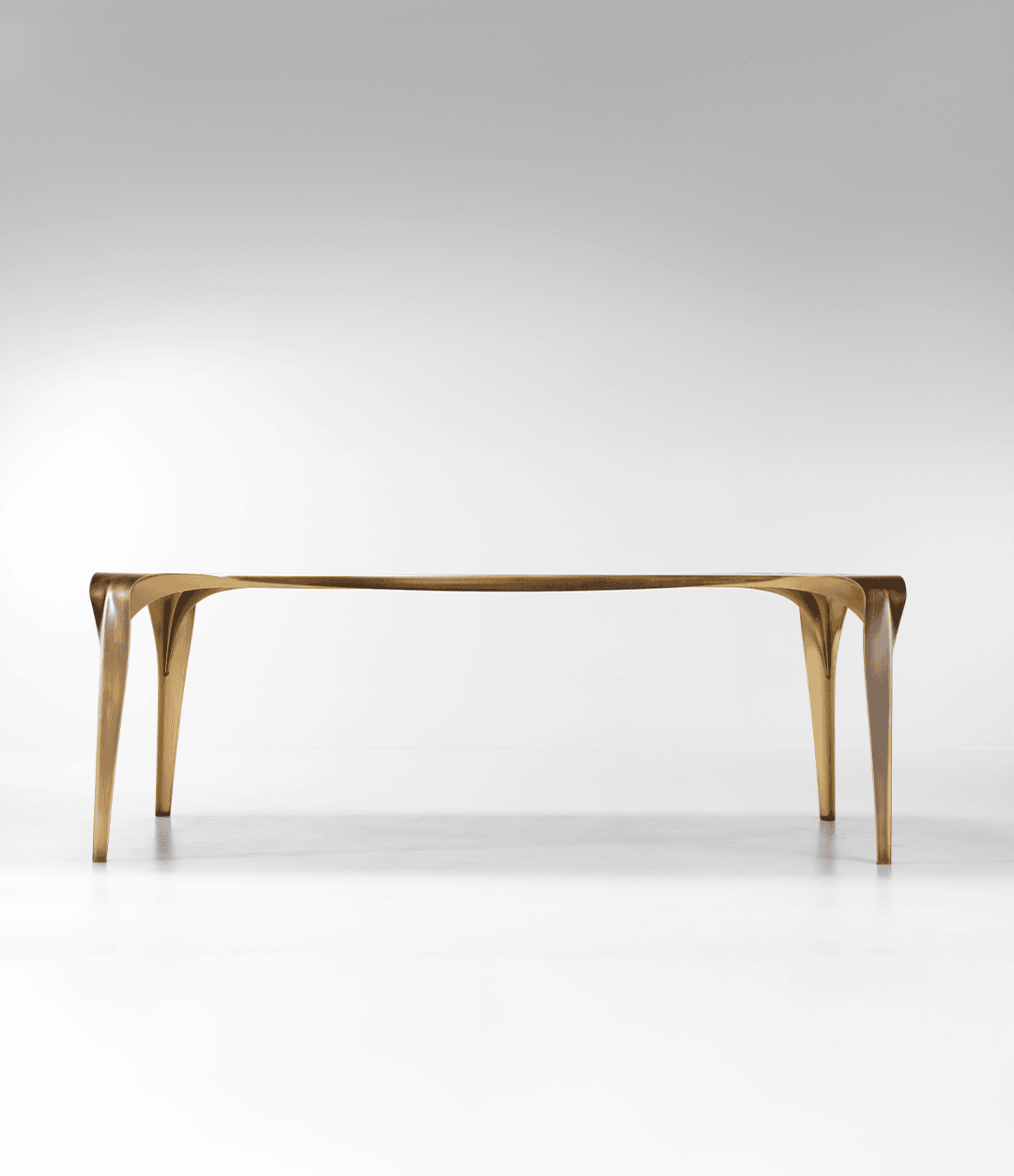 Края столешницы словно лепестки листа, плавно изгибаясь, создают широкую поверхность, украшенную эрозиями, формирующими плотные жилки, имитирующие материал, подвергшийся естественному старению и коррозии. Плавная, непрерывная форма стола позволяет взгляду скользить по сложной текстуре поверхности, делая Convivium выразительным центром интерьера.