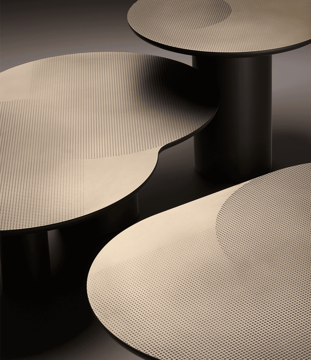 Коллекция столов Flocks вдохновлена плавным и завораживающим движением стай птиц в осеннем небе. Столешницы выполнены из листовой латуни или меди и могут быть простыми кругами или пересекающимися круглыми формами. Они опираются на один или два цилиндра различного диаметра.