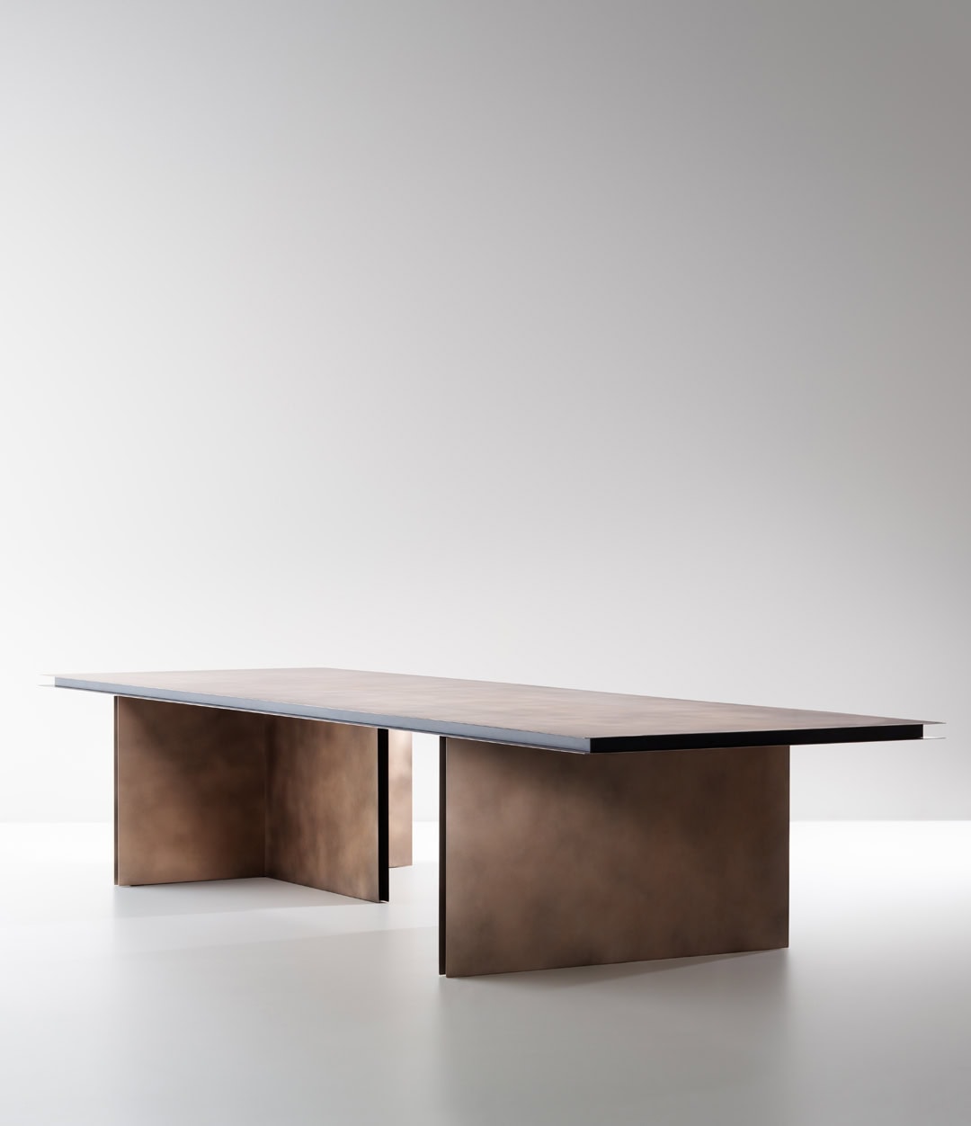 База стола продумана для стабильности и поддержки: две вертикальные плоскости обеспечивают устойчивость и одновременно достаточно пространства для ног при посадке. Folio Table XL сочетает архитектурную строгость и художественную выразительность, превращая стол в центральный элемент интерьера.