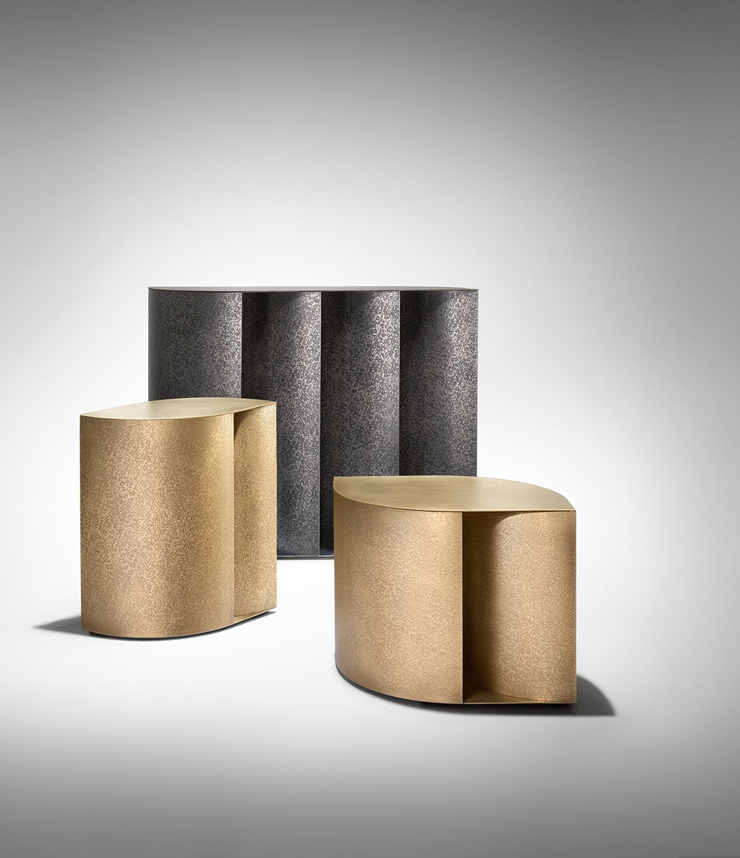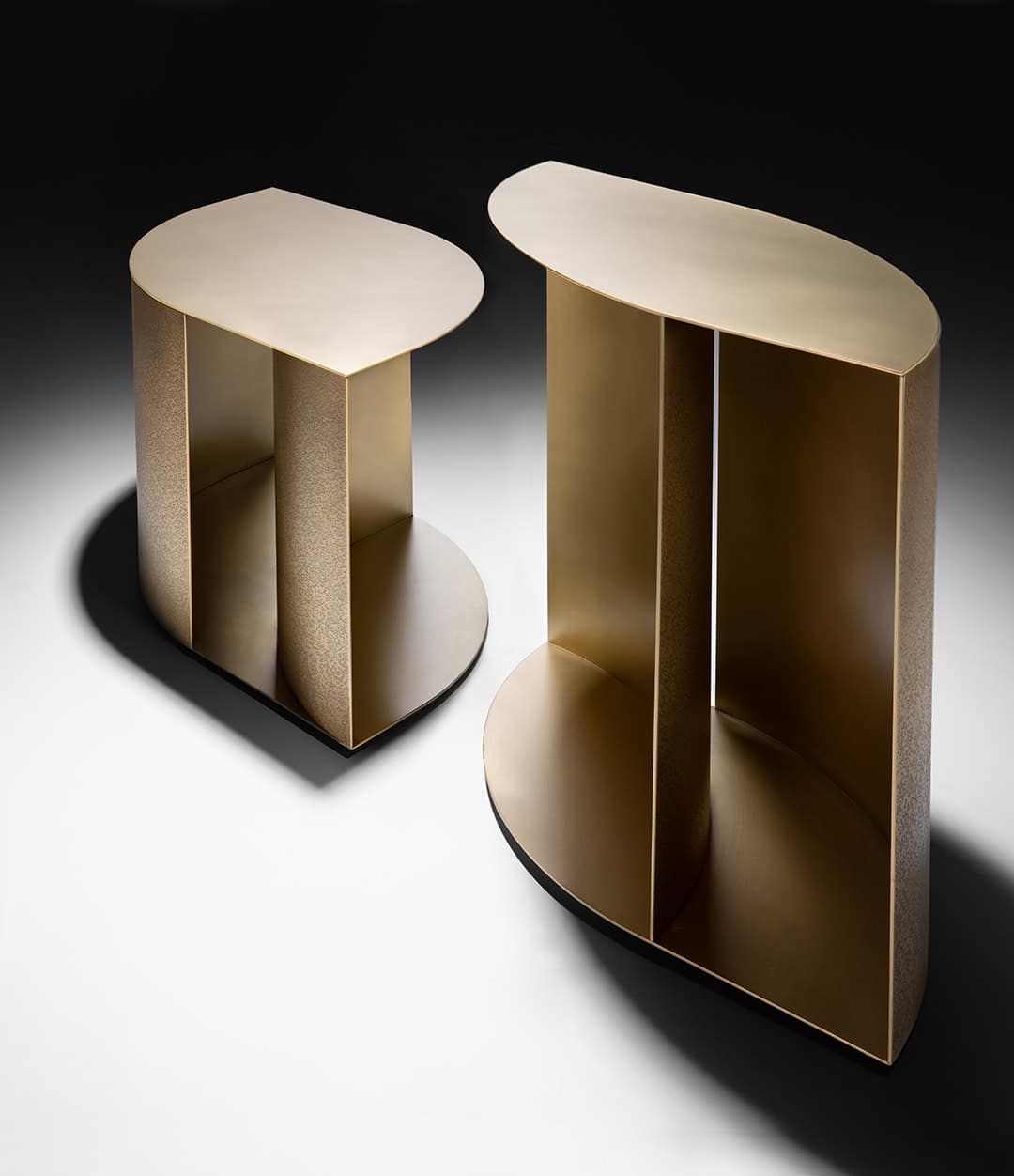 Основание столиков Sinestesia создано из изогнутых металлических листов, где контраст отделок подчёркивает мастерство De Castelli: внутренняя поверхность из шлифованного металла раскрывает естественную красоту материала, а внешняя, выполненная в технике DeErosion, добавляет глубины и характера. Столешница, вдохновлённая нежной формой листа, парит над структурой, создавая изящный баланс между формой и функцией.